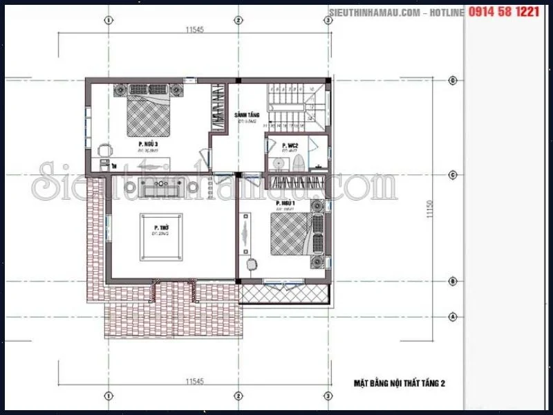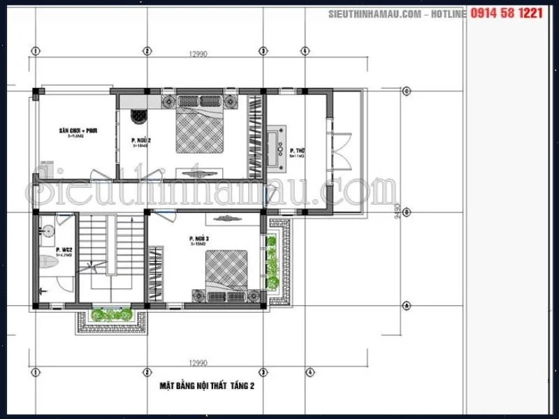 Mặt bằng tầng 2 nhà biệt thự mini 3 tầng 60m2 3 phòng ngủ