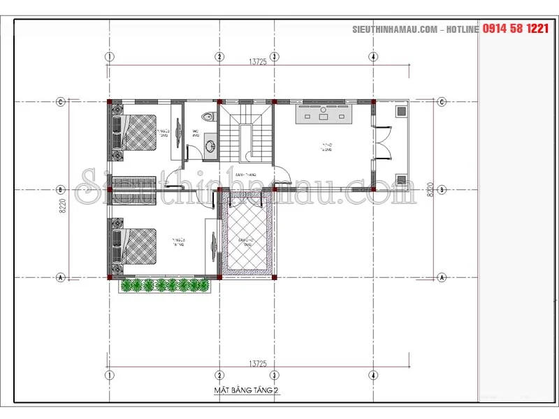 – Tầng 2: Phòng ngủ 2: (14m2), Phòng ngủ 3: (14m2), Phòng thờ: (12.5m2), WC2: (3.3m2)