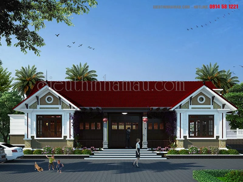 Đặc biệt xung quanh nhà được thiết kế mang đến cho ngôi nhà với hệ mái ngói thái đnăg đối với tông màu đỏ đun đậm nét truyền thống. Mái thái là một hệ mái có kết cấu đẹp, chi phí xây dựng sẽ cao hơn so với các nhà 1 tầng mái bằng. Tuy nhiên hệ mái thái của mẫu biệt thự 160m2 này tạo được sự thông thoáng cho phần nóc nhà, có tác dụng giúp giải thoát những hung khí, tà khí tích tụ trên nóc nhà.