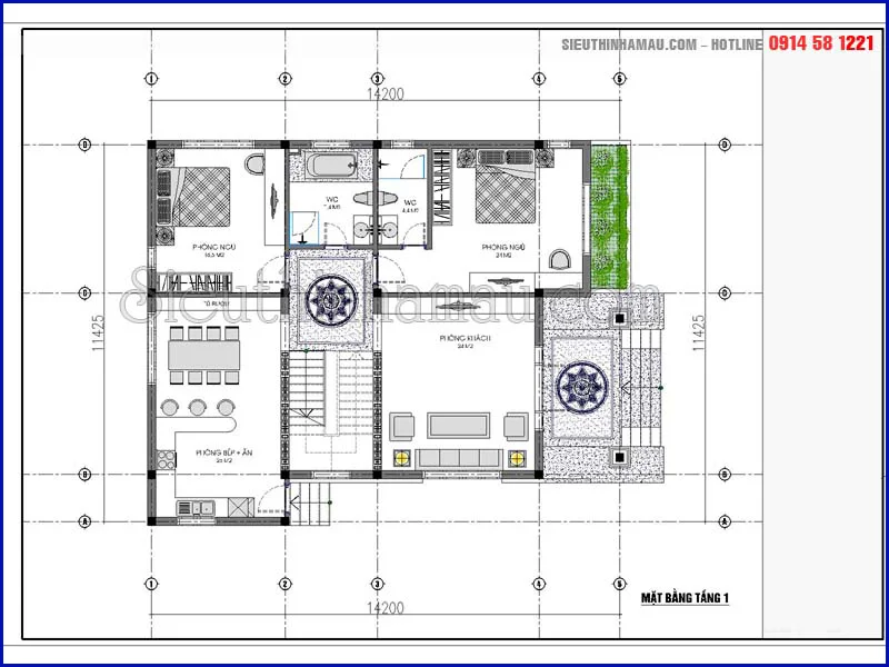 Bản vẽ mặt bằng tầng 1 nhà 2 tầng hoàn chỉnh 2 mặt tiền mái thái đẹp
