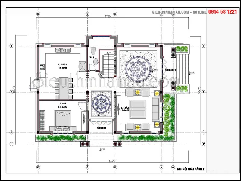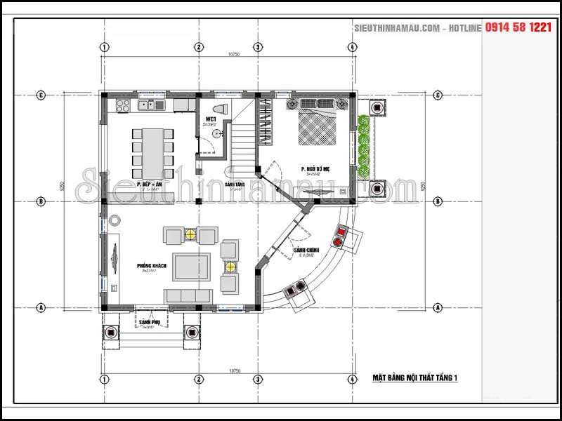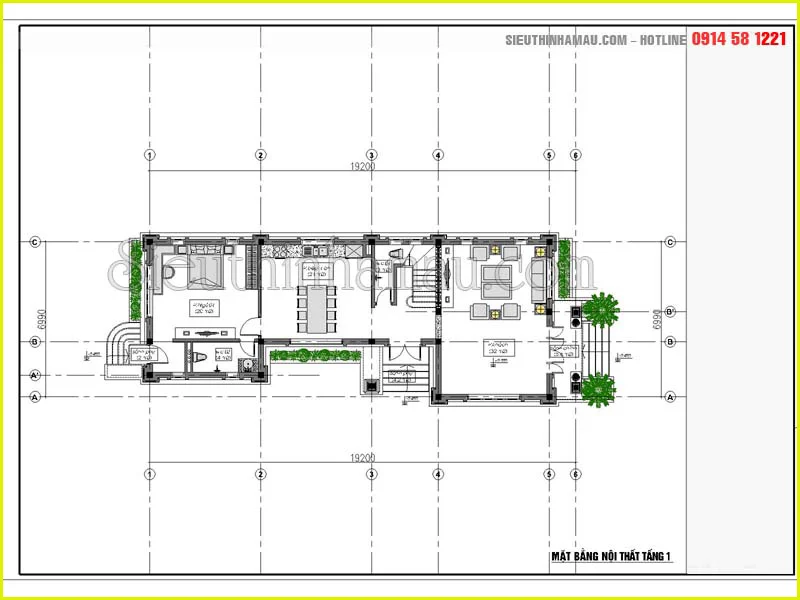 Bản vẽ nội thất tầng 1 biệt thự 10x12m 2 mặt tiền 2 tầng đẹp