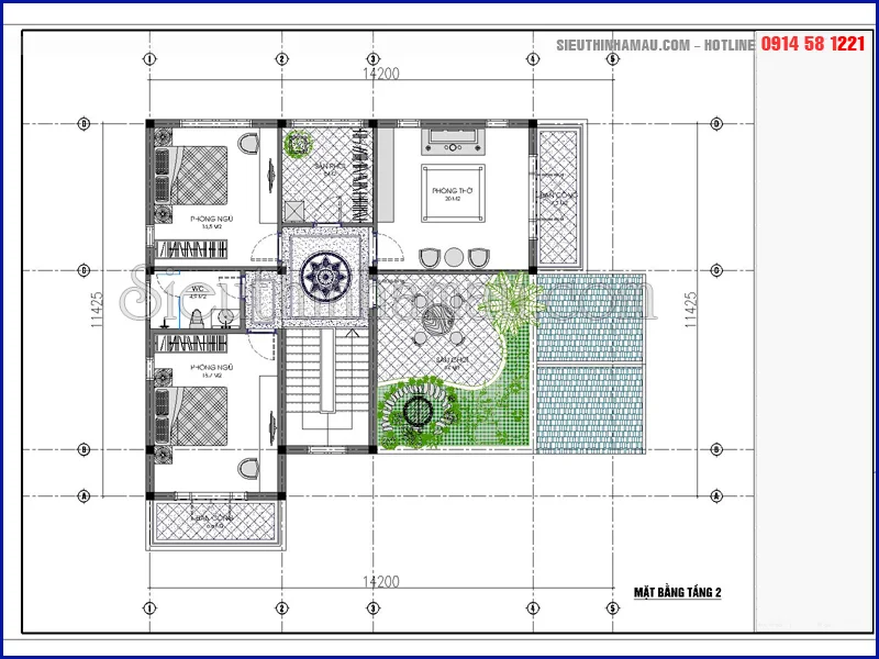 Bản vẽ tầng 2 mẫu thiết kế nhà 2 tầng hoàn chỉnh mái thái 2 mặt tiền