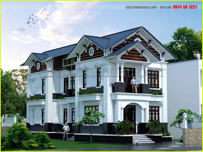 Thiết kế nhà 2 tầng 2 mặt tiền mái thái tân cổ điển được thiết kế đem đến sự thoáng đãng