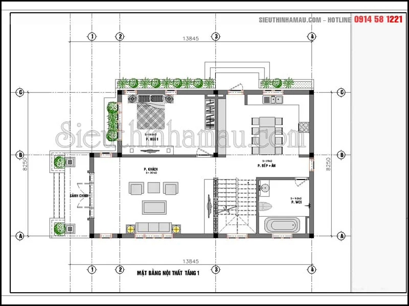 Mặt bằng tầng 1 nhà 2 tầng mái thái 2 mặt tiền