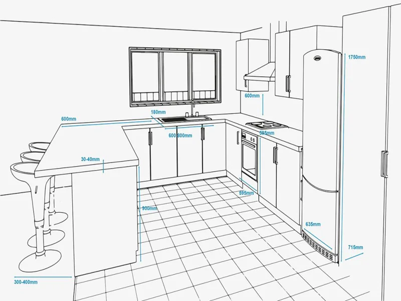 Diện tích bếp cần đảm bảo tối thiểu cho hệ thống tủ bếp với dây chuyền nấu bếp: tủ lạnh – chậu rửa – bếp nấu – bàn soạn. Tùy vào từng diện tích và nhu cầu gia đình sử dụng có thể thiết kế và điều chỉnh không gian bếp cho phù hợp, trong trường hợp khu vực phòng bếp không đủ diện tích đặt bàn thì bàn ăn có thể đặt ở không gian kế bên, có thể là phòng sinh hoạt chung hoặc không gian trung chuyển.