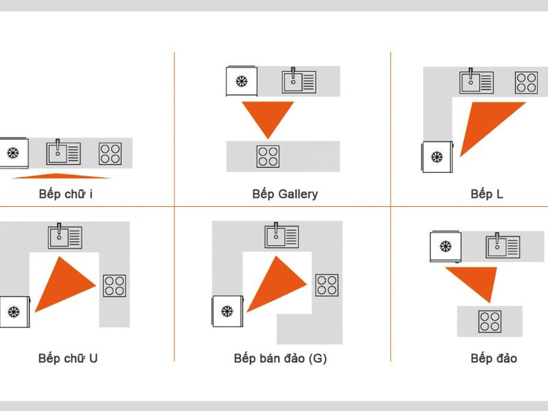 Bạn có thể đánh giá hiệu quả của việc bố trí nhà bếp bằng cách tính toán tam giác công việc. Tam giác làm việc càng nhỏ, bạn càng phải thực hiện ít bước di chuyển khi nấu ăn. Tổng chiều dài 3 cạnh của tam giác làm việc không được lớn hơn 8m